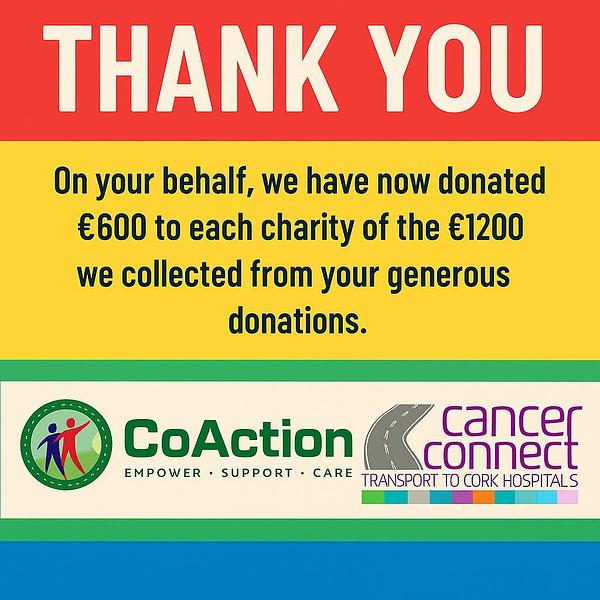 On behalf of the Clonakilty Tennis Club, we are proud to have donated €1200 to two local and deserving charities. CoAction and Cancer Connect will each receive €600.